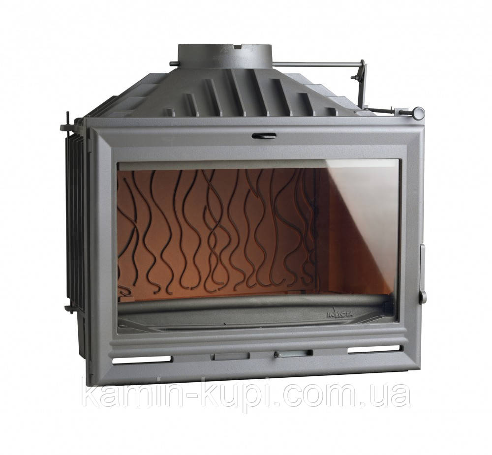 Закрита чавунна камінна топка Option 700 з шибером може забезпечити горіння однієї дров’яної закладки протягом 8-10 годин. Герметичність дверцят топки забезпечує спеціальний графітовий шнур. Жаростійке скло може витримувати температуру до 750ºС і завдяки технології «чисте скло» залишається прозорим під час горіння. Подача повітря в камеру згоряння проводиться знизу. Наявність спеціальних конвекційних отворів в рамці топки, подвійний допал чадних газів забезпечують топці емісію СО – 0,13% і ККД до 75%. Є можливість подачі повітря для горіння з вулиці (додаткова опція). Цю модель топки для каміна сміливо можна вважати найбільш вдалим варіантом з серії бюджетних топок французької компанії Invicta, в ній застосовано багато конструкторських рішень, характерних для більш дорогих моделей.
